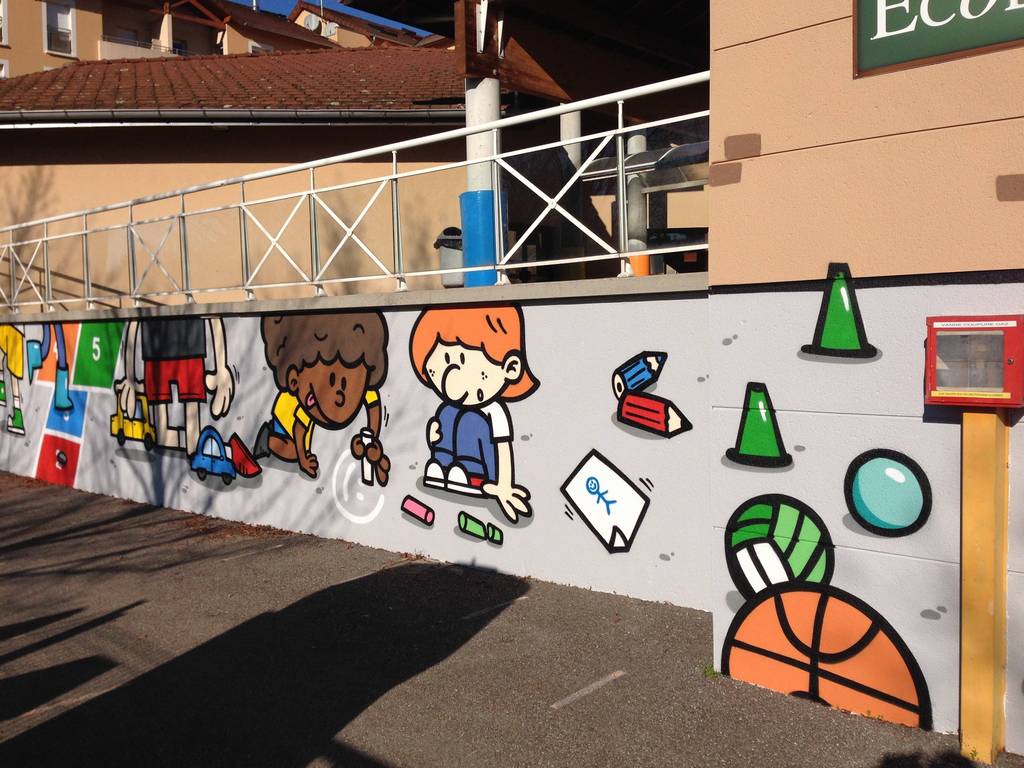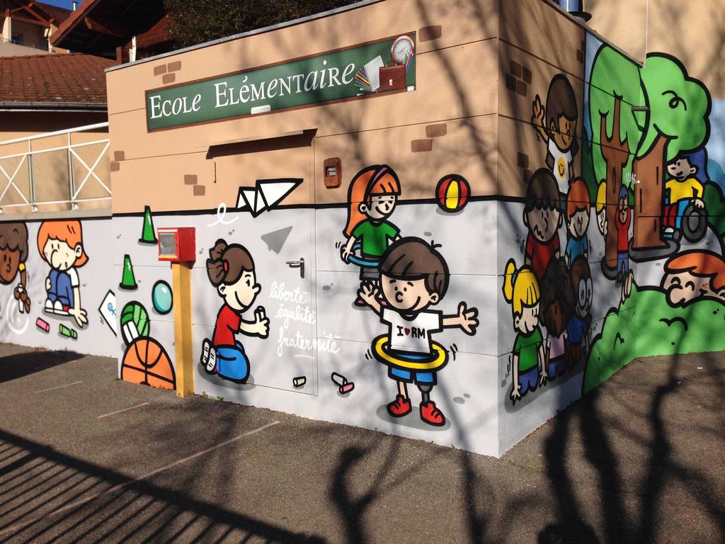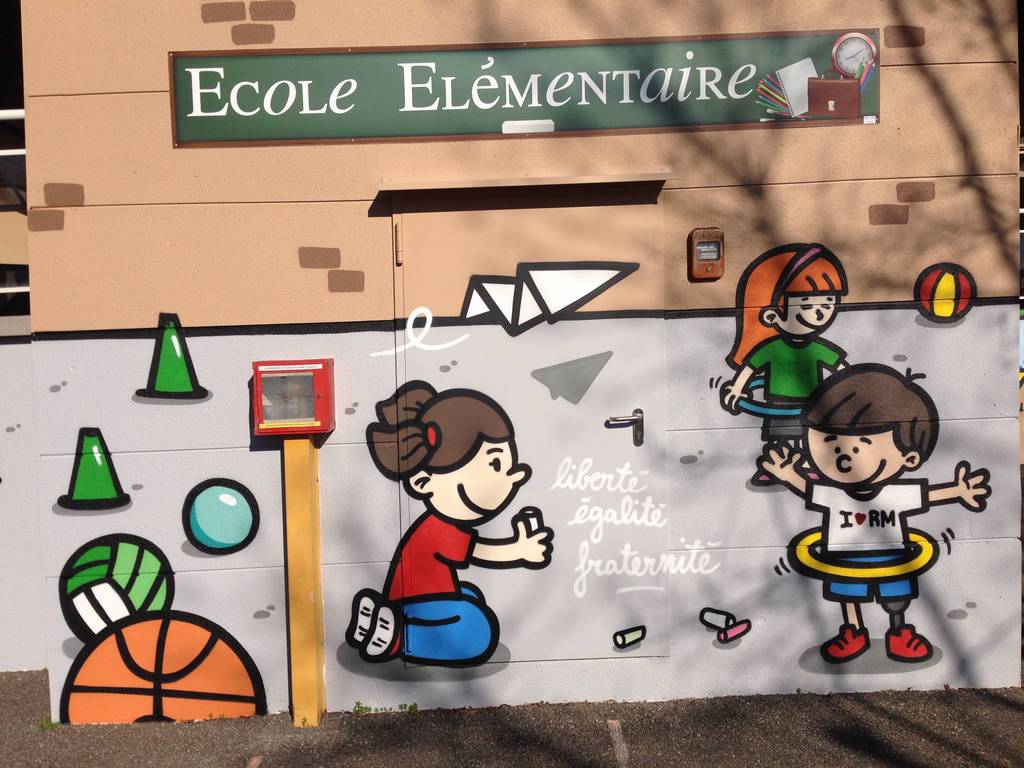 Une première rencontre avec Renaud Gobert, artiste peintre, a eu lieu dans chaque classe pour travailler sur les représentations des élèves. Les enfants ont ensuite dessiné les premiers éléments sur papier. A partir de ces dessins l'artiste a élaboré la maquette de la peinture murale, ensuite validée par la mairie et l'équipe enseignante. Il est intervenu dans chaque classe afin de faire peindre à tour de rôle tous les élèves de l'école.